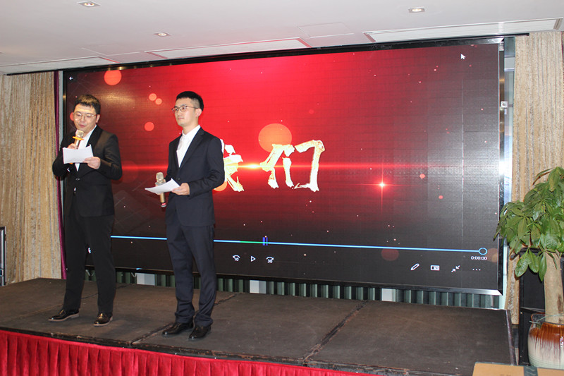 晚会临近开幕,所有与会者在晚会LED背景墙前拍照留念,记录下安顺船务“年夜饭”合家欢的一家亲场面瞬间。晚会由安顺船务两位年轻英俊的“金牌主持”施津阳、沈佳杰主持。